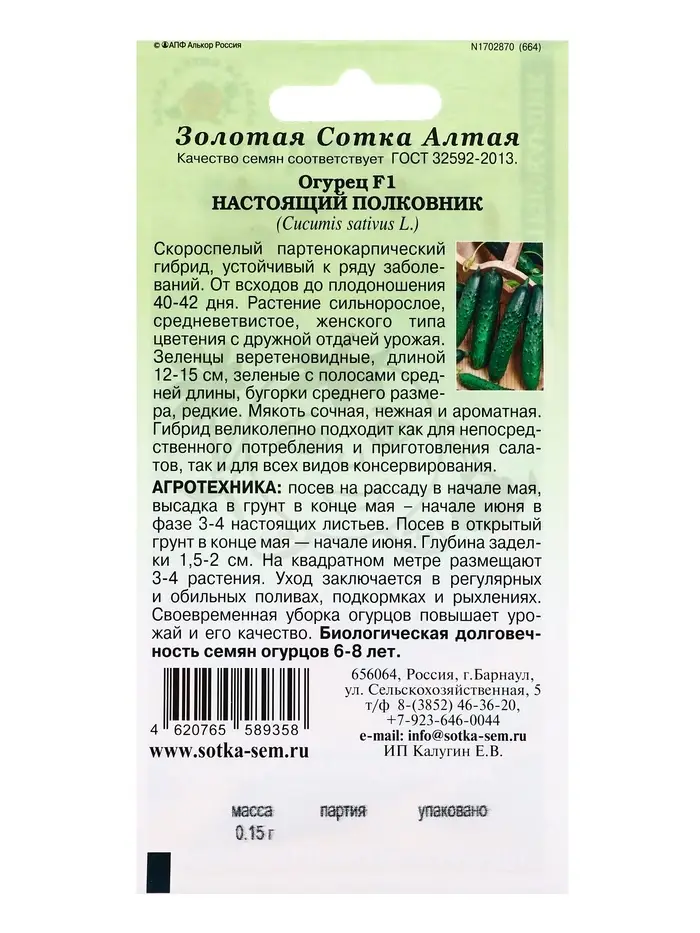 Семена Огурец Настоящий полковник F1 /Сотка/ 0,15г / партен. раннесп. 12-15см/*1500