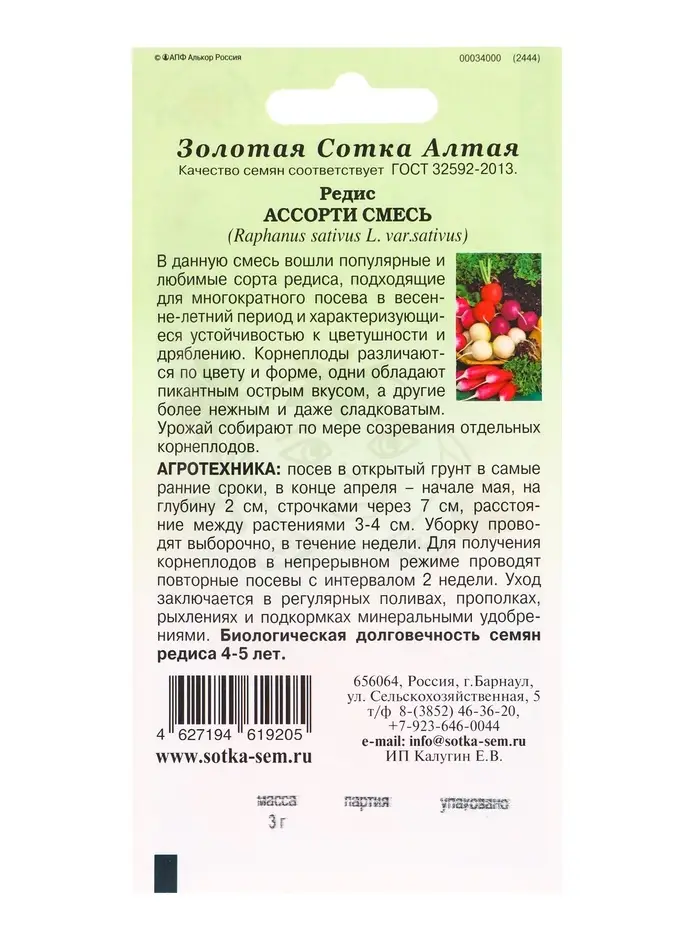 Семена Редис Ассорти смесь /Сотка/ 3г/*650