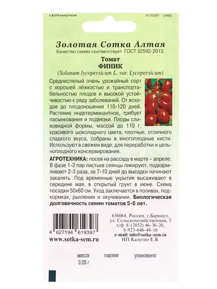 Семена Томат Финик /Сотка/ 0,05г/ среднесп. индетерм. до 110г /*1500