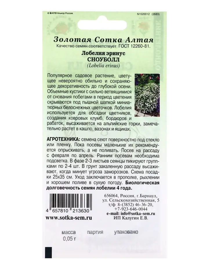 Семена Лобелия Сноуболл эринус /Сотка/ 0,05 г/*1800