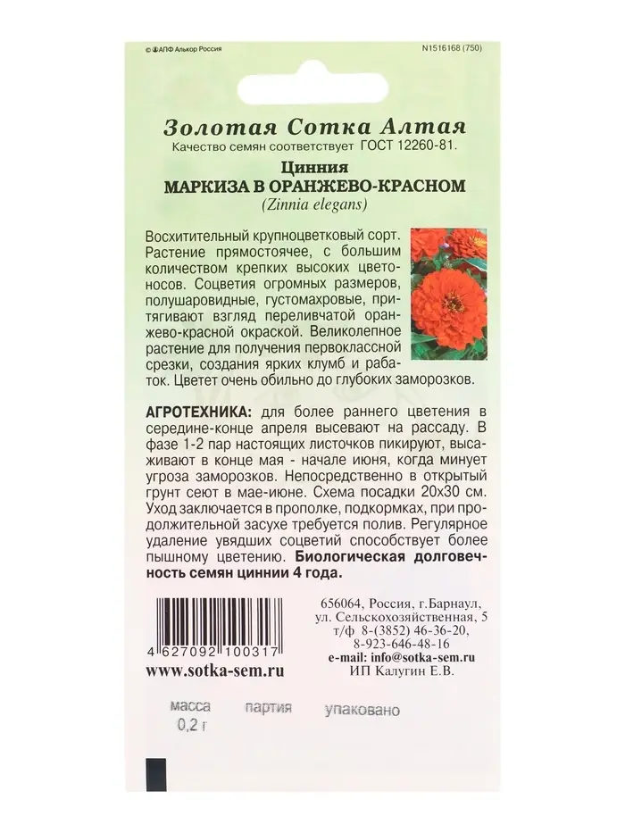 Семена Цинния Маркиза в Оранжево-красном /Сотка / 0,2г/ h-80см d-14см /*1200