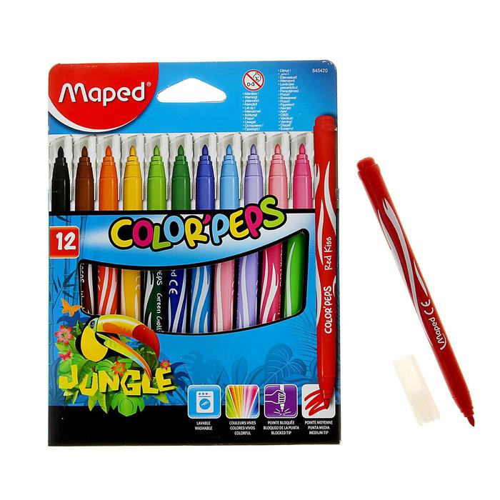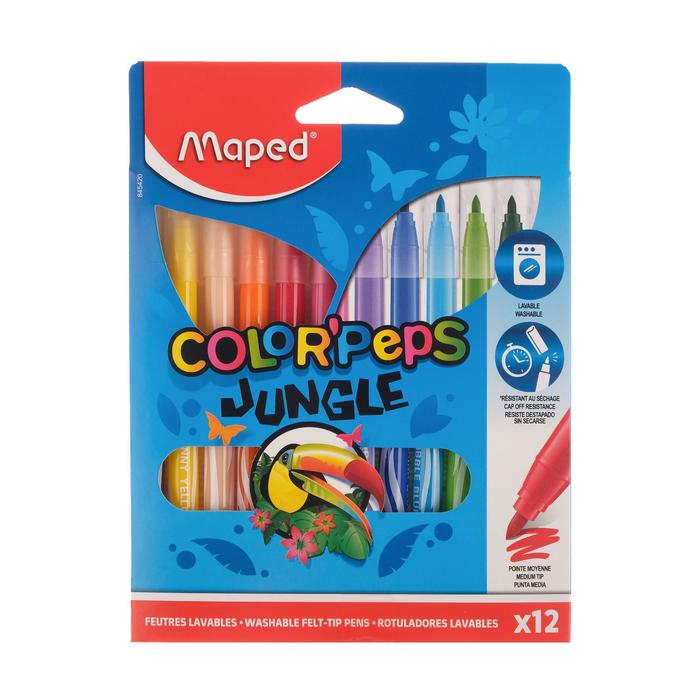 Фломастеры утолщённые, 12 цветов, JUNGLE, смываемые, европодвес