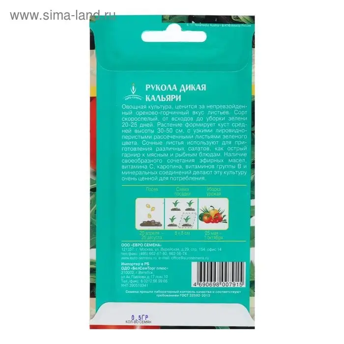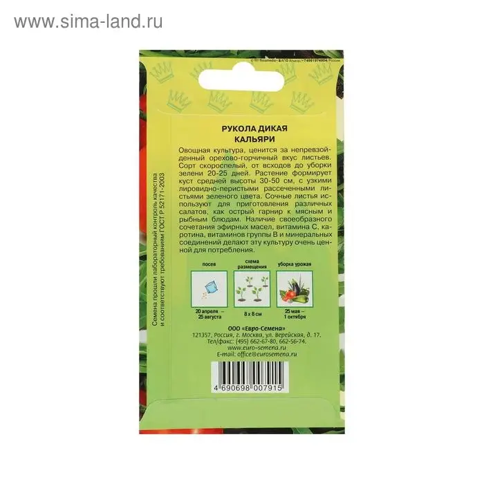 Овощная культура, ценится за непревзойденный орехово-горчичный вкус листьев. Сорт скороспелый, от всходов до уборки зелени 20-25 дней. Растение формирует куст средней высоты 30-50 см, с узкими лировидно-перистыми рассеченными листьями зеленого цвета. Сочные листья используют для приготовления различных салатов, как острый гарнир к мясным и рыбным блюдам. Наличие своеобразного сочетания эфирных масел, витамина С, каротина, витаминов группы В и минеральных соединений делают эту культуру очень ценной для потребления.