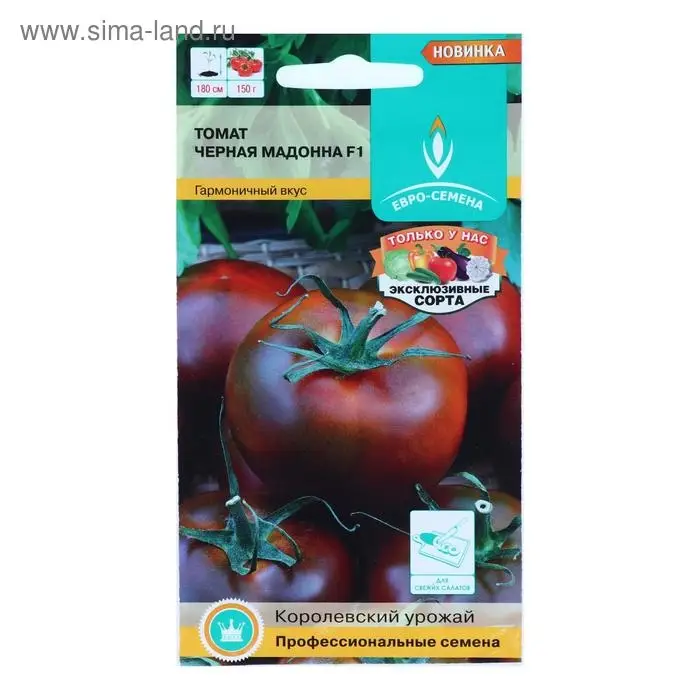 Новый черноплодный гибрид томата, великолепно созревающий в условиях средней полосы России. Раннеспелый, от всходов до плодоношения – 90-95 дней. Растение индетерминантное, листья темно-зеленые. Первое соцветие закладывается над 8-9 листом, последующие - через 3 листа. В кисти 5-6 плодов. Плоды выравненные, сладкие, красивые, очень плотные, массой 140-150 г, при полном созревании темно-коричневые, содержат много сухого вещества. Вкус – великолепный в результате гармоничного сочетания сахаров и кислоты. Использование – универсальное. Гибрид отличается высокой устойчивостью к комплексу болезней, высоким содержанием ликопина, плоды не растрескиваются даже при очень обильном поливе.