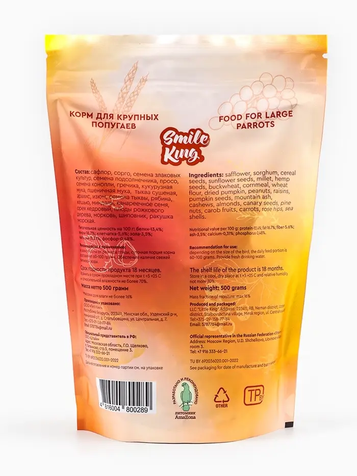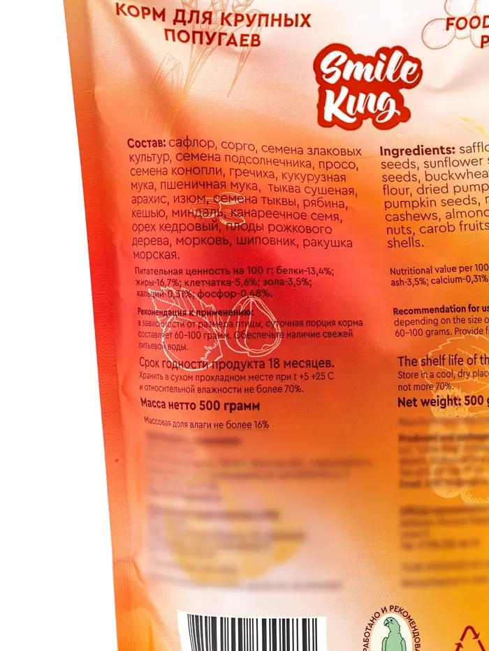 Smile King корм для крупного попугая, дой-пак пакет 500г.