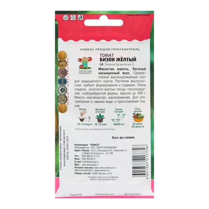 Томат Бизон жёлтый - мясистая мякоть, богатый насыщенный вкус. Среднеспелый высокоурожайный сорт для пленочных теплиц. Период от всходов до создания 115-120 дней. Растение высокорослое, требует формирования и подвязки. Очень сладкие, золотисто-желтые плоды плоскоокруглой, слаборебристой формы, массой до 450 г. Мякоть маслянистая, малосемянная. Для употребления в свежем виде и приготовления соусов. Стимулятор плодообразования ТОМАТОН - гарантия высокого урожая при любых неблагоприятных условиях роста.