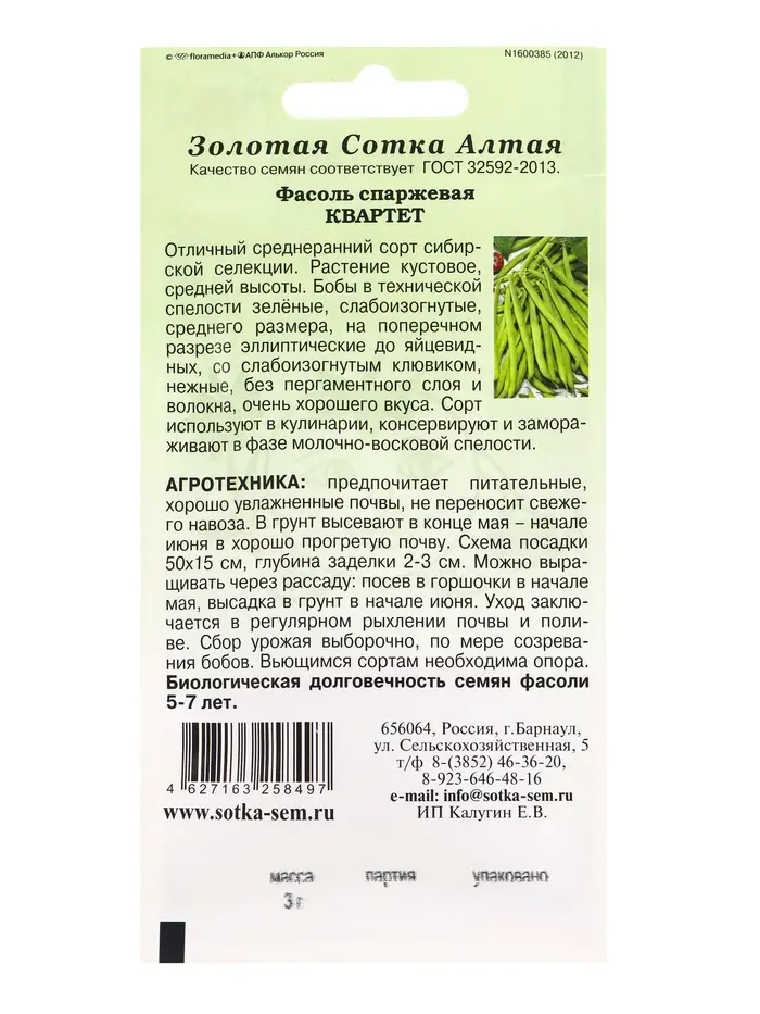 Семена Фасоль Квартет фасоль /Сотка/ 3 г /*450
