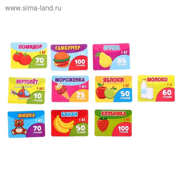 Сканер «считывает» штрихкоды на продуктах. Юному продавцу нужно посчитать сумму покупки, а покупателю — оплатить наличными или кредитной картой.