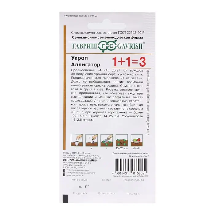 Семена Укроп 1+1 "Аллигатор", ц/п, 4,0 г
