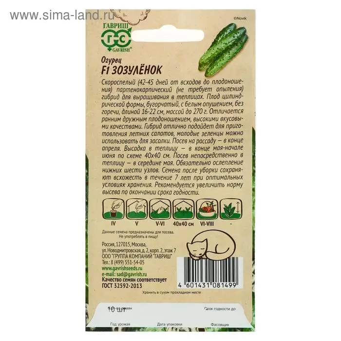 Скороспелый (42-45 дней от всходов до плодоношения) партенокарпический (не требует опыления) гибрид для выращивания в теплицах. Плод цилиндрической формы, бугорчатый, с белым опушением, без горечи, длиной 16-22 см, массой до 270 г. Отличается ранним дружным плодоношением, высокими вкусовыми качествами. Гибрид отлично подойдет для приготовления летних салатов, молодые зеленцы можно использовать для засолки. Посев на рассаду — в конце апреля. Высадка в теплицу — в конце мая-начале июня, по схеме 40х40 см. Посев непосредственно в теплицу — в середине мая. Обязательно ослепление нижних шести узлов.