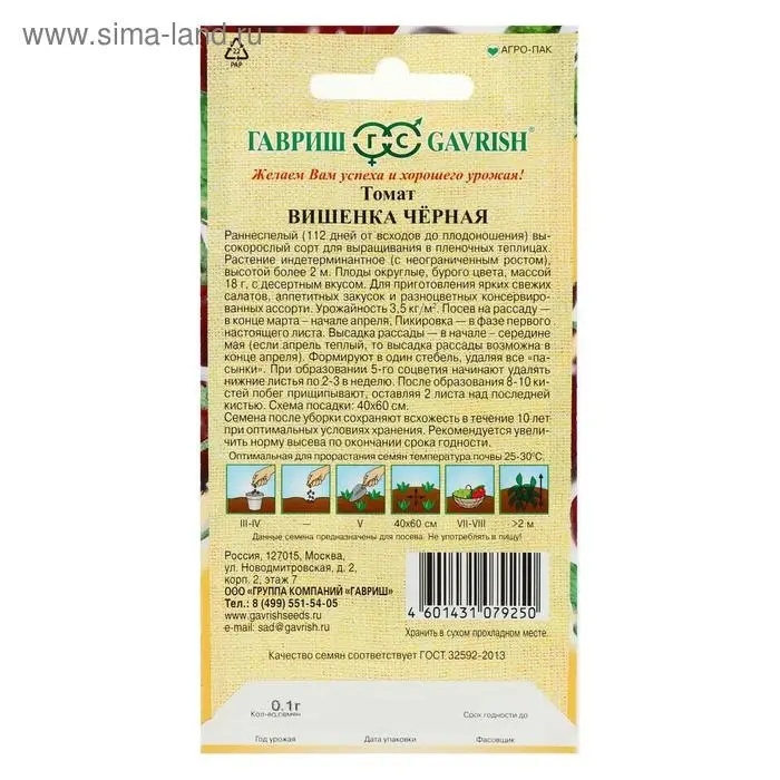 Раннеспелый (112 дней от всходов до плодоношения) высокорослый сорт для выращивания в пленочных теплицах. Растение индетерминантное (с неограниченным ростом), высотой более 2 м. Плоды округлые, бурого цвета, массой 18 г, с десертным вкусом. Для приготовления ярких свежих салатов, аппетитных закусок и разноцветных консервированных ассорти. Урожайность 3,5 кг/м2. Посев на рассаду - в конце марта - начале апреля. Пикировка - в фазе первого настоящего листа. Высадка рассады - в начале середине мая (если апрель теплый, то высадка рассады возможна в конце апреля). Формируют в один стебель, удаляя все «пасынки». При образовании 5-го соцветия начинают удалять нижние листья по 2-3 в неделю. После образования 8-10 кистей побег прищипывают, оставляя 2 листа над последней кистью. Схема посадки: 40х60 см.