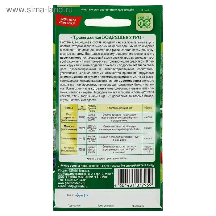 Семена Травы для чая "Бодрящее утро", ц/п, 0,3 г