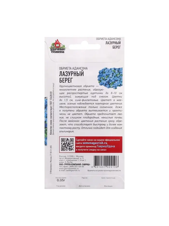 Семена цветов Обриета "Лазурный берег", ц/п, 0,05 г