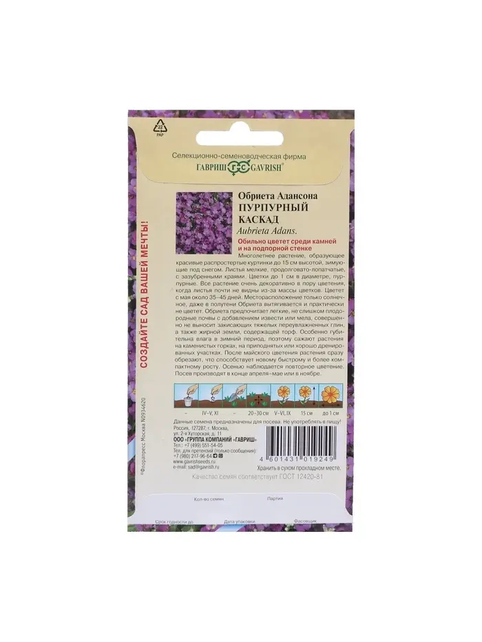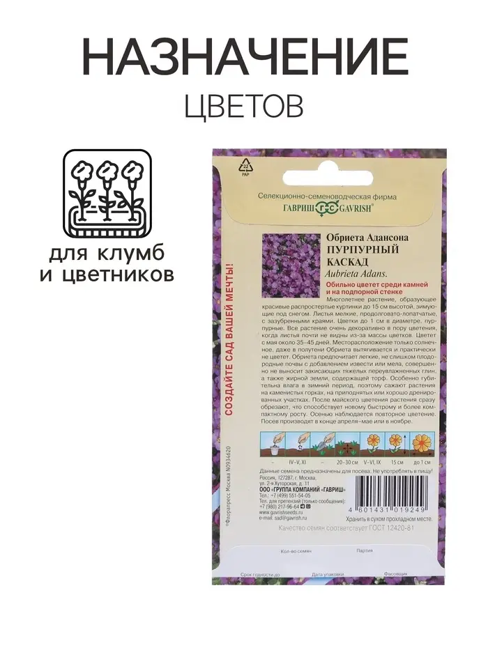 Семена цветов Обриета "Цветущий ковер", многолетник, 0,1 г