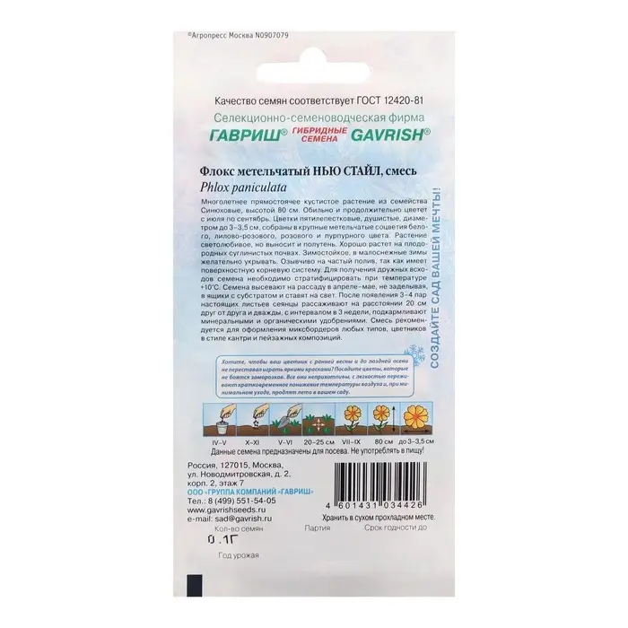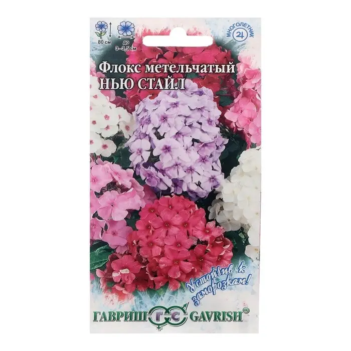 Многолетнее прямостоячее кустистое растение из семейства Синюховые, высотой 80 см. Обильно и продолжительно цветет с июля по сентябрь. Цветки пятилепестковые, душистые, диаметром до 3–3,5 см, собраны в крупные метельчатые соцветия белого, лилово-розового, розового и пурпурного цвета. Растение светолюбивое, но выносит и полутень. Хорошо растет на плодородных суглинистых почвах. Зимостойкое, но в малоснежные зимы желательно укрывать. Флокс отзывчив на частый полив, так как имеет поверхностную корневую систему. семена флоксов высевают под зиму на очищенную от сорняков грядку или в небольшой ящик со смесью огородной земли, песка и перегноя, на глубину 1 см. Следят, чтобы посевы были постоянно покрыты снегом. Весной ящичек можно занести в парник или в дом. Когда всходы окрепнут их рассаживают на расстоянии 20 см друг от друга и дважды, с интервалом в 3 недели, подкармливают минеральными и органическими удобрениями. Смесь рекомендуется для оформления миксбордеров любых типов, цветников в стиле кантри и пейзажных композиций.