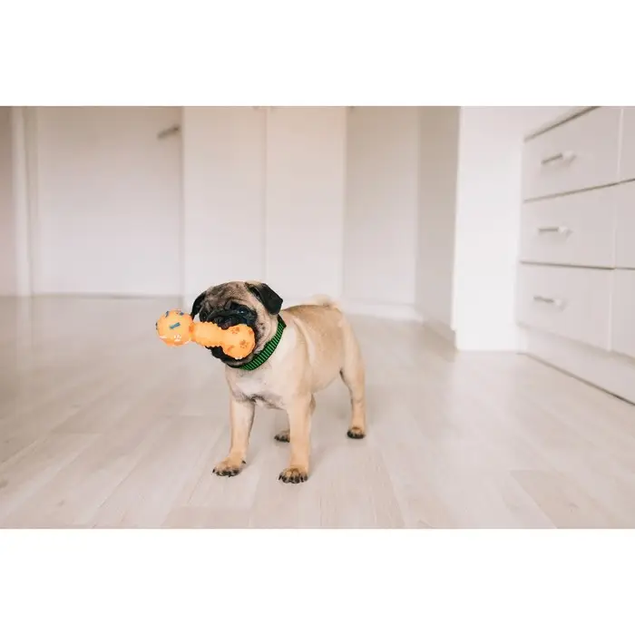 Игрушка изготовлена из безопасного материала и не предназначена для разгрызания. Во время игр виниловые игрушки можно жевать, благодаря этому они массируют дёсны и отчищают зубы собаки от налёта. Таким образом во время игр совмещается приятное с полезным.