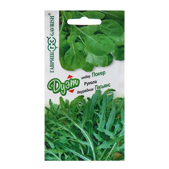 Рукола (двурядник, индау) дикая Пасьянс: Скороспелый (от всходов до уборки зелени 20-25 дней) сорт. Розетка листьев полуприподнятая, диаметром 15-18 см, высотой до 20 см, средней массой 20 г. Лист зеленый, сильнорассеченный, ароматный, орехово-горчичного вкуса.