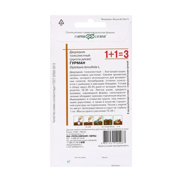 Семена Двурядник тонколистный, рукола Триция, 0,5 г