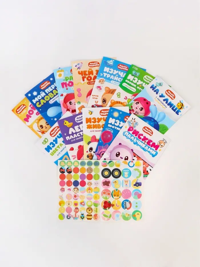 Годовой курс «Малышарики» — это 12 творческих книг для занятий с детьми от 1 года. Каждая посвящена отдельной теме: овощи и фрукты, животные и транспорт, формы, цвета, погода, противоположности, первый словарик и даже лепка (пластилин можно использовать любой). Все задания адаптированы под возраст, а наклейки делают обучение игрой, а не обязанностью.