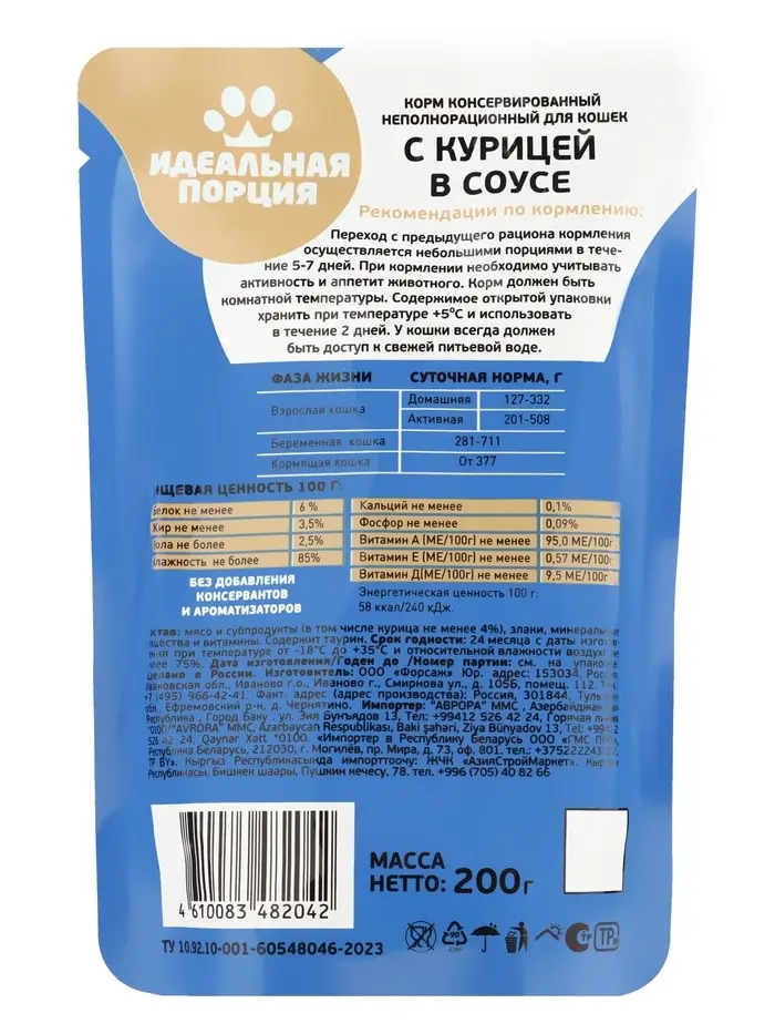 Корм для кошек «Идеальная порция» с курицей в соусе, 200 г
