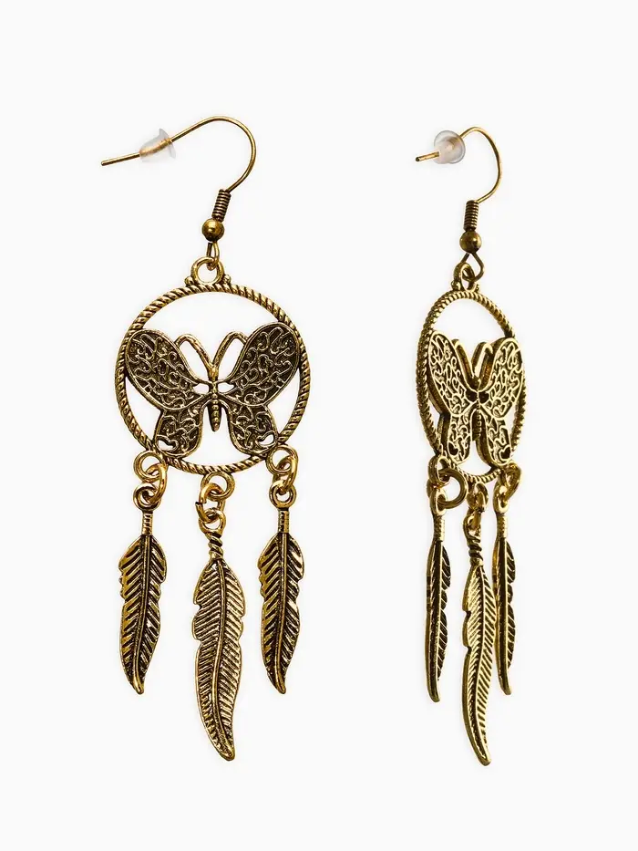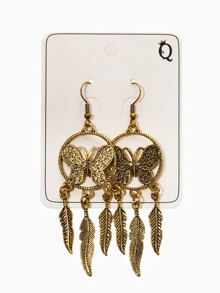 Серьги метал "Аутентичность" бабочка с перьями, цвет чернёное золото