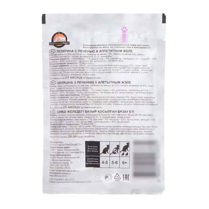 Сырьевой состав (на 100 г): мясо и субпродукты (в том числе телятина не менее 10%, печень не менее 4%), злаки, растительное масло, таурин, витамины А, D3, Е, минералы.