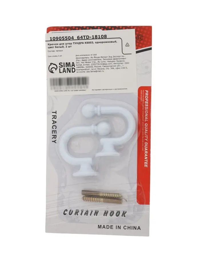 Крючок для штор ТУНДРА KS003, однорожковый, цвет белый, 2 шт