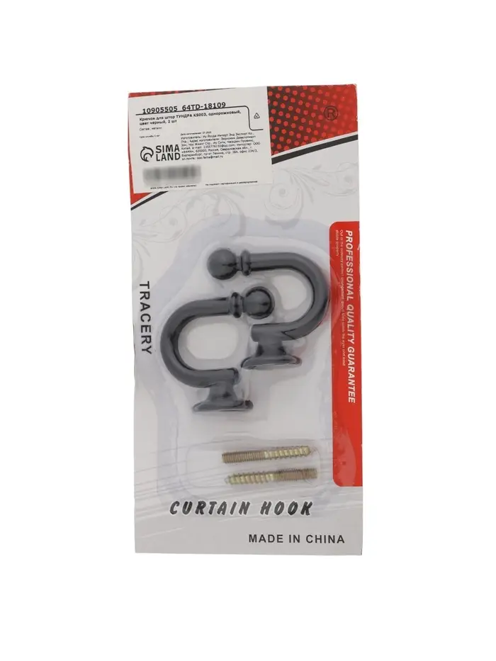 Крючок для штор ТУНДРА KS003, однорожковый, цвет черный, 2 шт