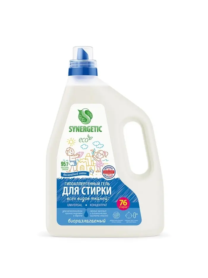 Биоразлагаемый концентрированный гель для стирки всех видов тканей SYNERGETIC UNIVERSAL с ароматом "Бескрайний океан" обеспечивает бережное и эффективное очищение тканей, гигиеническую чистоту одежды и устраняет неприятные запахи.