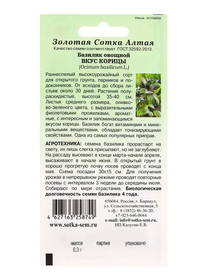 Семена Базилик Вкус Корицы /Сотка/ 0,3г/ раннесп. зелен. с фиол. прожил. 35-40см /*1200