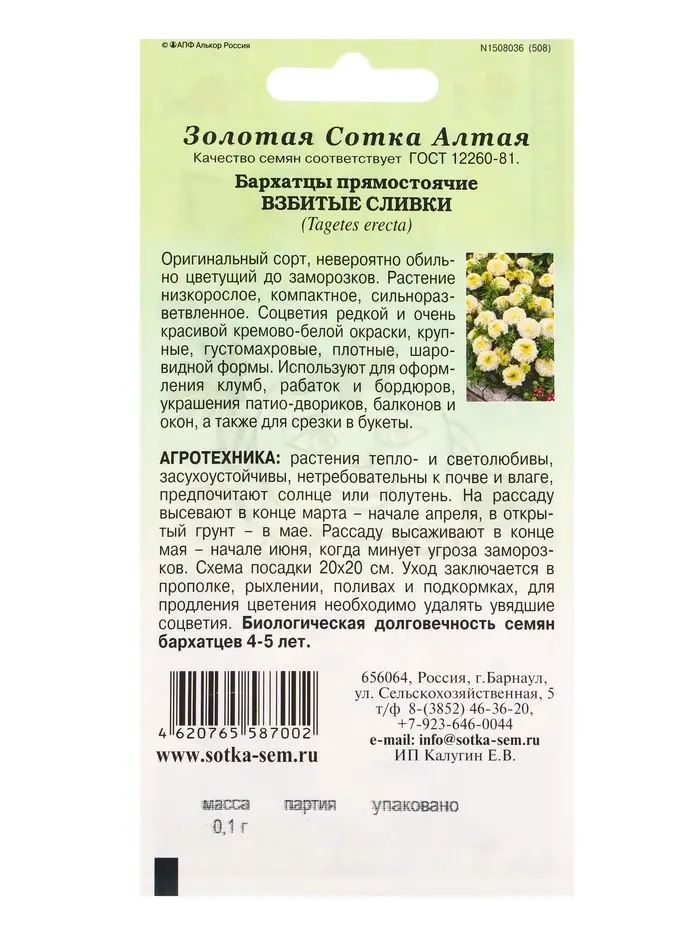 Семена Бархатцы Взбитые Сливки /Сотка/ 0,1г/ прям. белые 35см, d-7см/*1500