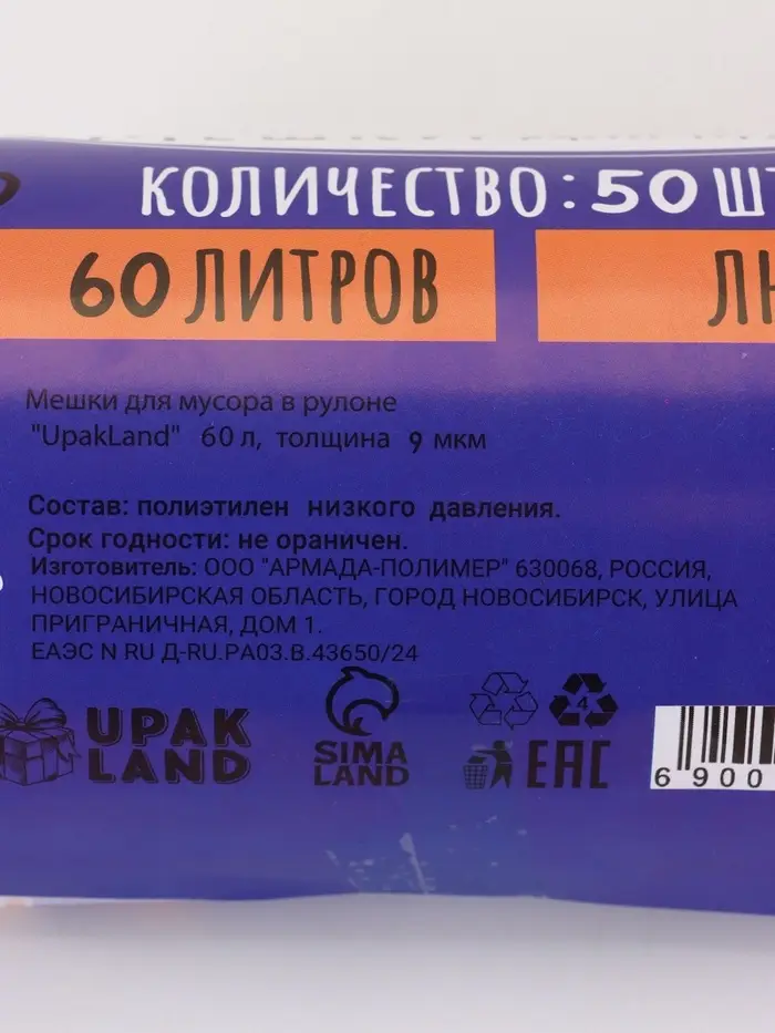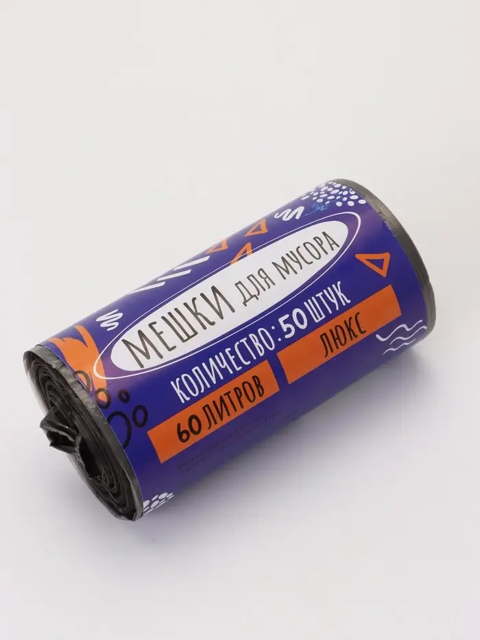 Мешки для мусора в рулоне 60 л, черные, ПНД, 9 мкм, 50 шт