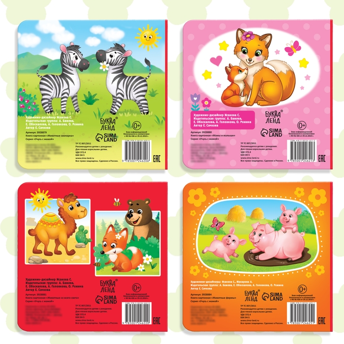 Набор картонных книг — это яркие страницы с весёлыми стишками и изображениями животных. В форме увлекательной игры ребёнок запоминает названия зверей и узнаёт среду их обитания.