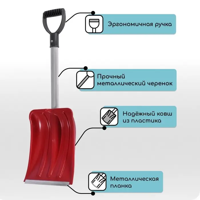 Лопата для уборки снега, автомобильная, пластиковый ковш 380×370 мм, алюминиевая планка, алюминиевый черенок, с ручкой