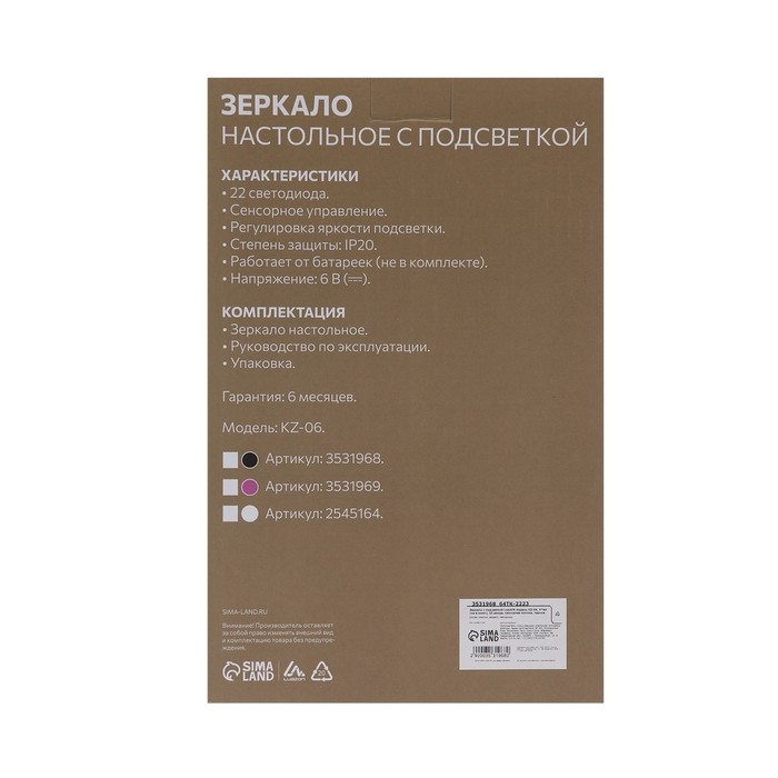 Зеркало LuazON KZ-06 оснащено 22-мя светодиодами. Имеет функцию сенсорного управления и возможность регулировки наклона. Работает от батареек (не в комплекте).