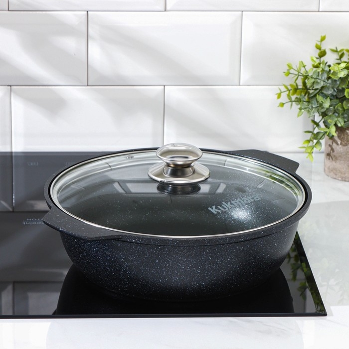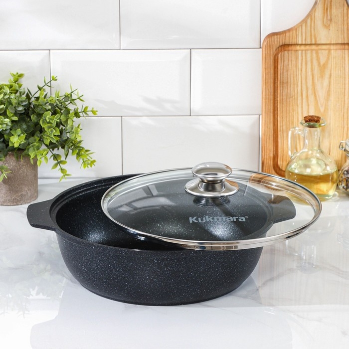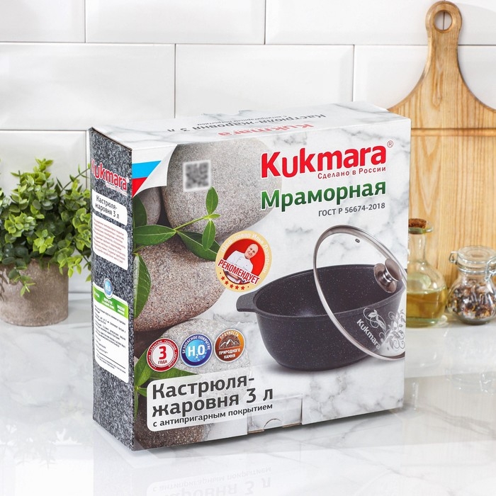 Кастрюля-жаровня Kukmara сделана из литого алюминия. Имеет инновационное антипригарное мраморное покрытие на водной основе, которое изготовлено по немецкой технологии (Weilburger Coatings GmbH) и усилено сверхтвёрдыми частицами минералов.
