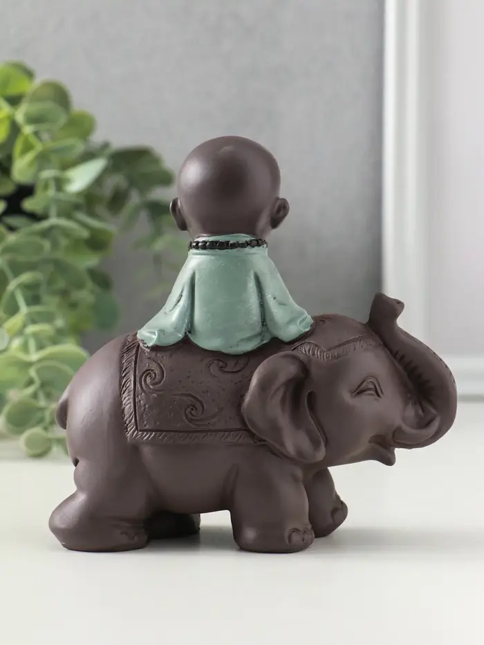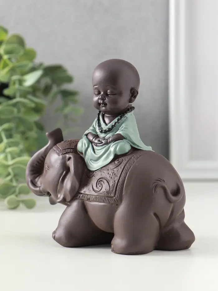 Сувенир полистоун "Маленький будда на слоне" зелёно-коричневый 5,5х12х12 см