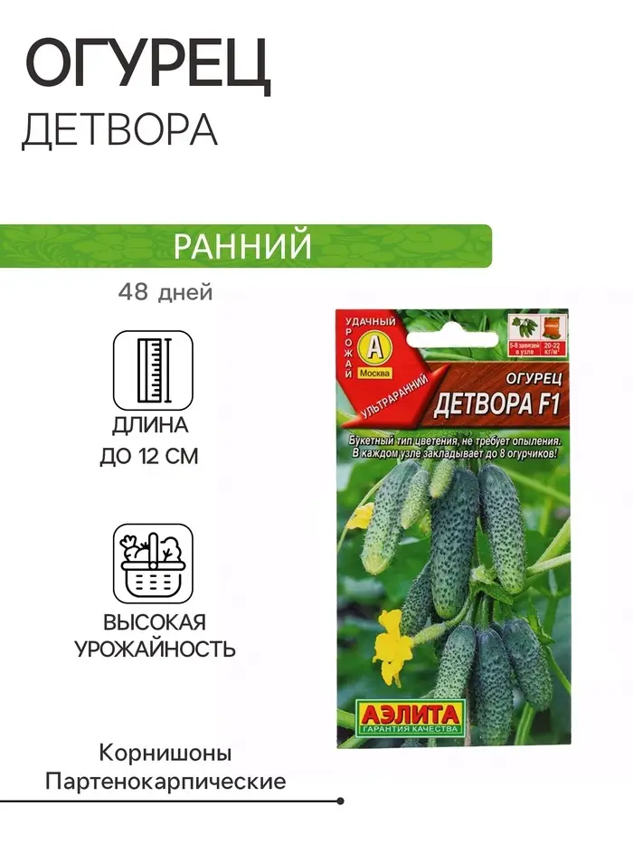 Ультраранний, высокоурожайный партенокарпический гибрид. Первые огурчики снимают через 41-43 дня после всходов. Для пленочных укрытий и открытого грунта. Плодоношение дружное, в каждом узле формируется 5-8 завязей. Зеленцы короткие, массой 100-120 г. Плоды не перерастают и не горчат. Подходит для выращивания пикулей и корнишонов. Урожайность – 6-8 кг с растения.