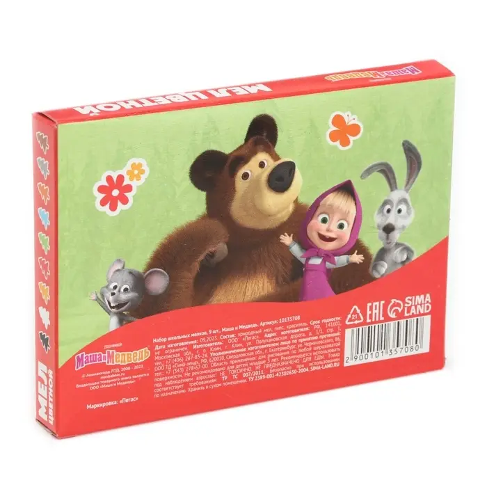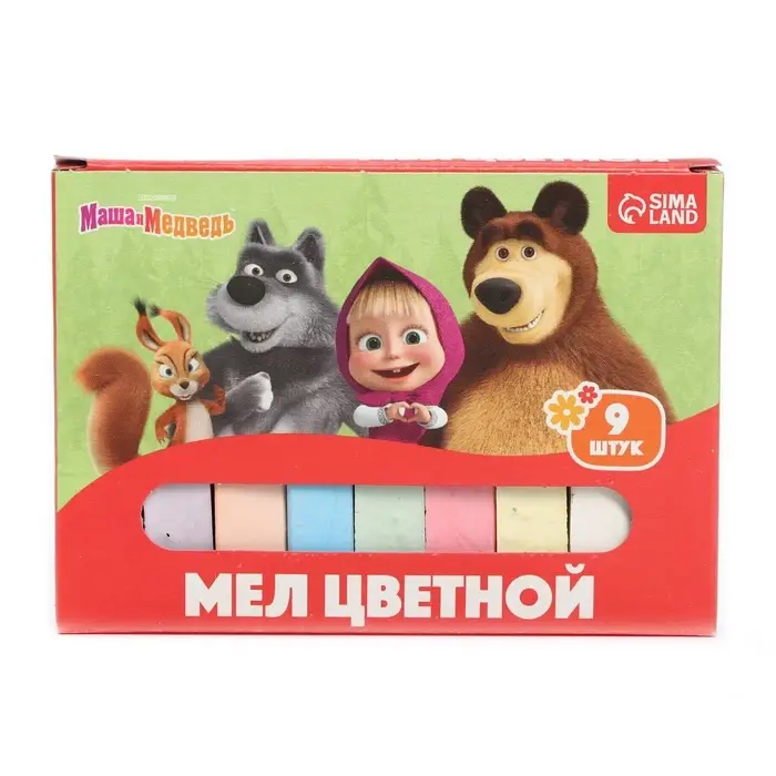 Мелки цветные школьные, набор 9 шт. «Маша и медведь», прямоугольные