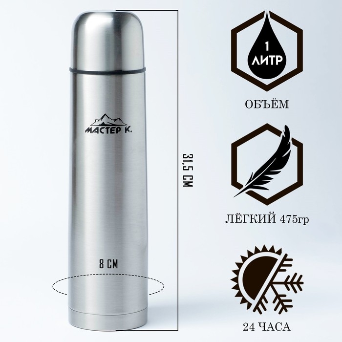 Термос 1 л "Мастер К" изготовлен из высококачественной нержавеющей стали, имеет двойные стенки, обеспечивающих вакуумную термоизоляцию. Легкий и прочный термос "Мастер К" сохранит ваши напитки горячими или холодными надолго. Это идеальный выбор для тех, кто хочет наслаждаться горячими напитками во время отдыха на природе или в поездках, напиток останется теплым и свежим, готовым к наслаждению в любой момент. Термосы этой серии пользуются большой популярностью у активных и динамичных пользователей, а также у любителей охоты и рыбалки, так как они, сохраняют прочность и термоустойчивость, легки и компактны.