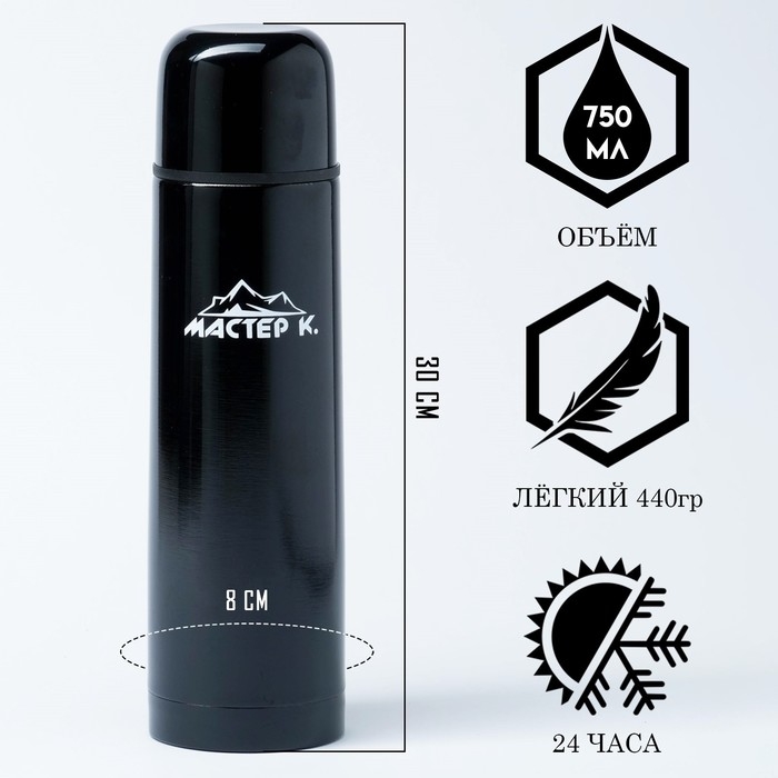Термос 750 мл "Мастер К" изготовлен из высококачественной нержавеющей стали, имеет двойные стенки, обеспечивающих вакуумную термоизоляцию. Легкий и прочный термос "Мастер К" сохранит ваши напитки горячими или холодными надолго. Это идеальный выбор для тех, кто хочет наслаждаться горячими напитками во время отдыха на природе или в поездках, напиток останется теплым и свежим, готовым к наслаждению в любой момент. Термосы этой серии пользуются большой популярностью у активных и динамичных пользователей, а также у любителей охоты и рыбалки, так как они, сохраняют прочность и термоустойчивость, легки и компактны.
