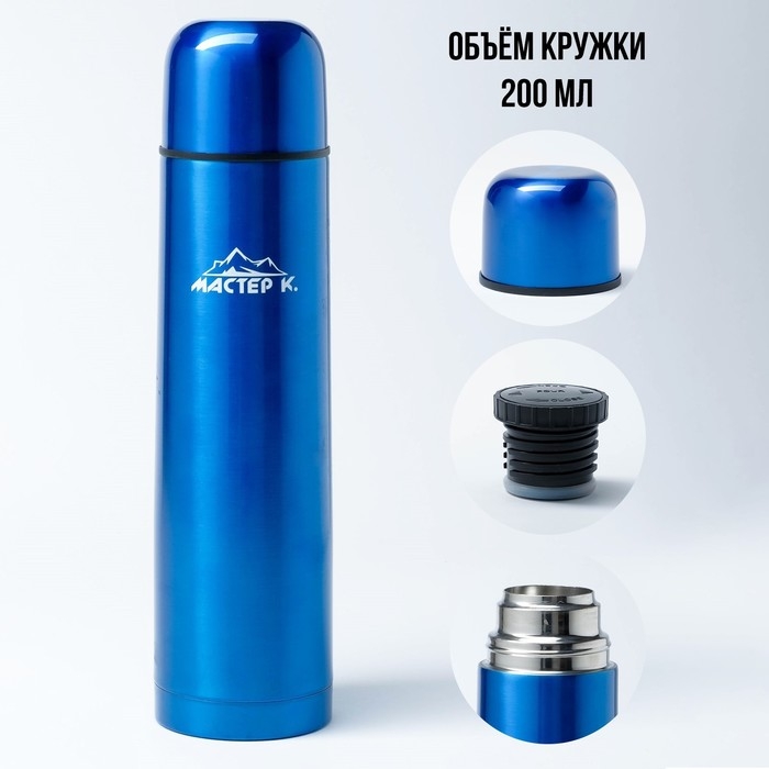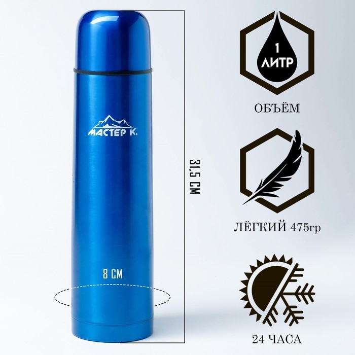 Термос, 1 л, Гильза "Мастер К", с кружкой, сохраняет тепло 24 ч, гарантия 5 лет, синий
