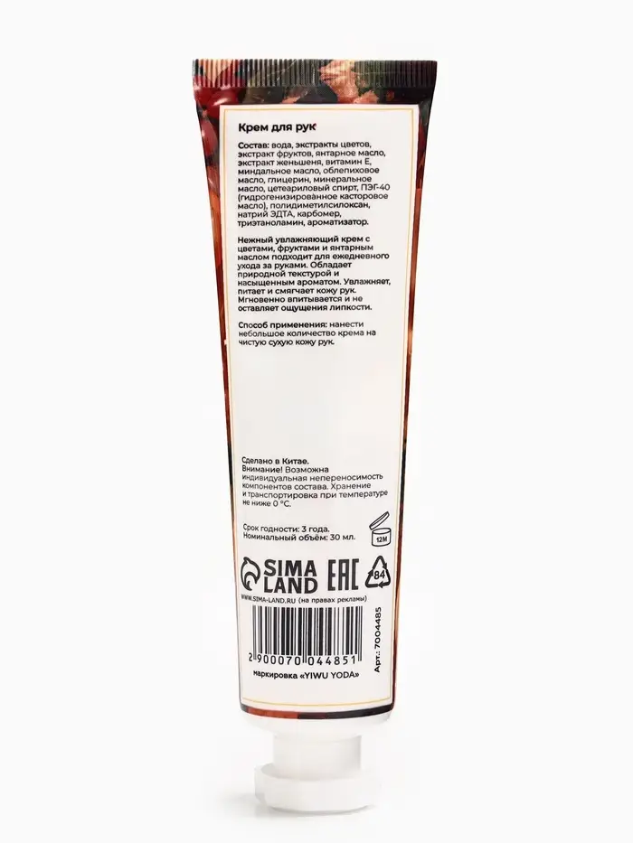 Крем для рук «Цветы, фрукты, янтарь» увлажняющий, 30 мл