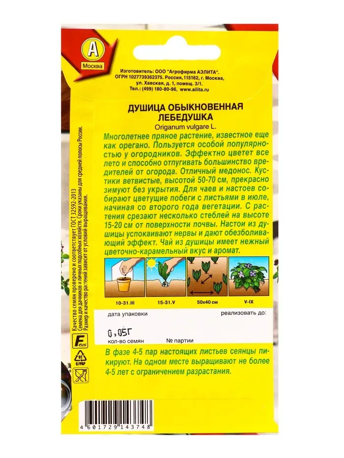 Семена Душица обыкновенная Лебедушка Целебный чай, Ц/П,0,05 г