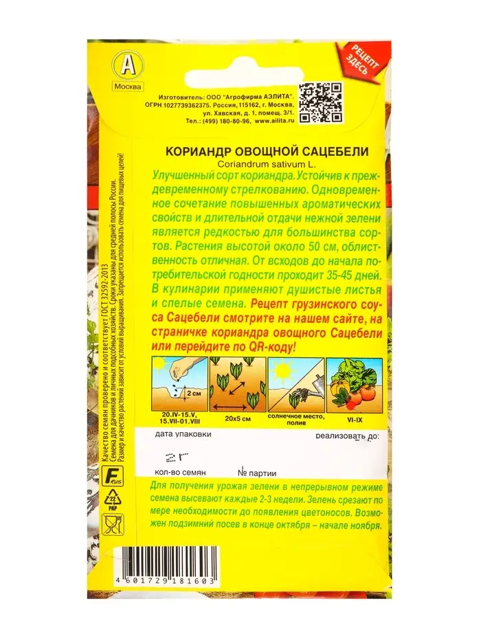 Семена Кориандр овощной Сацебели Блюда стран мира, Ц/П,2 г