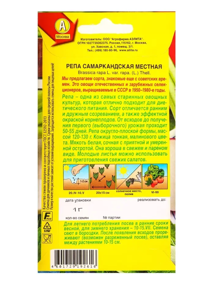 Семена Репа Самаркандская местная Сделано в СССР, Ц/П,1 г