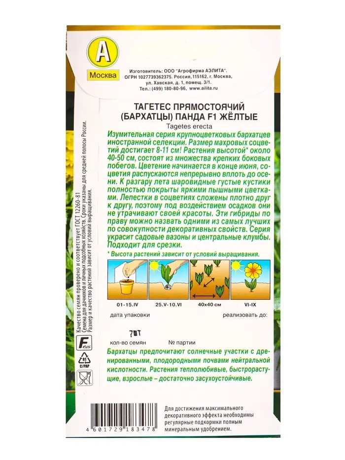 Семена цветов Бархатцы Панда F1 желтые прямостоячие Золотая серия, Ц/П,7 шт.