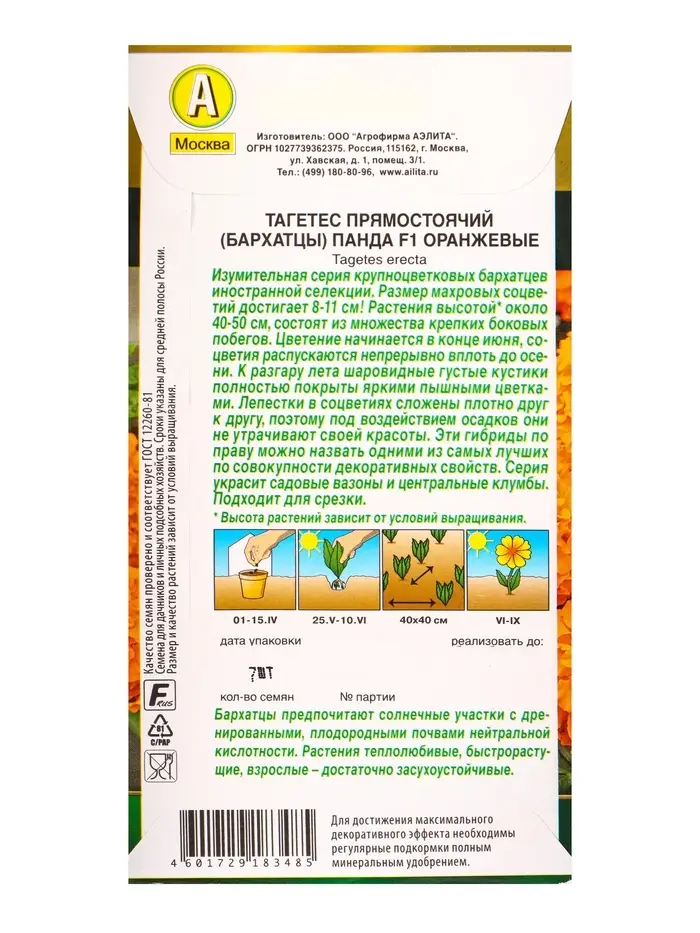 Семена цветов Бархатцы Панда F1 оранжевые прямостоячие Золотая серия, Ц/П,7 шт.