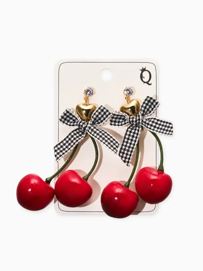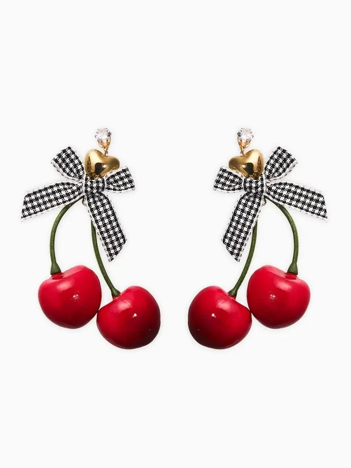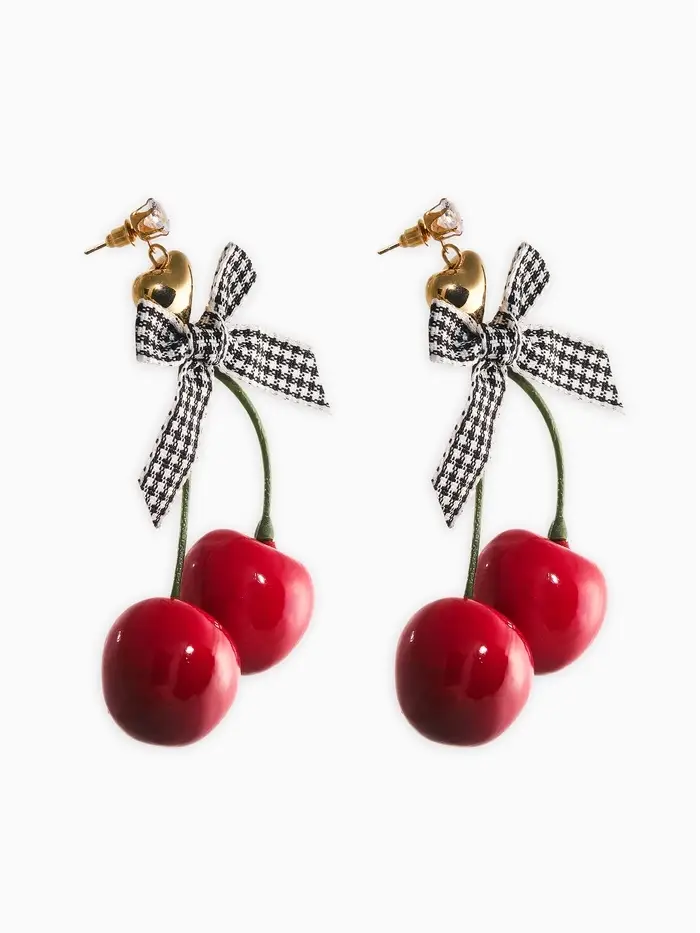 Серьги "Вишня с бантиками" текстиль, цветные в золоте