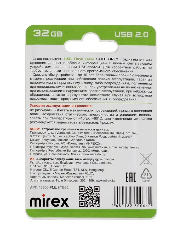 Флешка Mirex STIFF, 32 Гб ,USB 2.0, чт до 25 Мб/с, зап до 29 Мб/с, металлич. корпус, серая